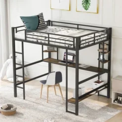 Full Size Metal Loft Bed With Long Desk And Shelves, Black – ModernLuxe