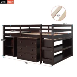 - [Sufficient Storage Space] In order to maximize the use of space, this multifunctional loft bed with desk meets the space-saving requirements. The free-standing desk with casters can be pulled out and pushed in according to different needs, which is the perfect design for limited spaces. The three drawers can hold a lot of cloth or daily necessities, and the shelves support enough space for books, toys and school supplies, etc.