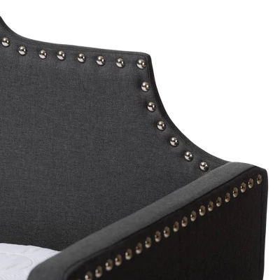 Featuring a roll-out trundle bed, the Ally daybed can easily transform any space from living room to bedroom. Constructed from solid rubberwood and MDF wood, the Ally is foam-padded and upholstered in an elegant neutral fabric for easy coordination with a wide range of color palettes. The daybed is fitted with a pull-out twin size trundle, providing convenient accommodation for guests. Designed with both function and style in mind, the daybed features an elegant cut-out frame accented with chrome nailheads for a touch of glamour. This dynamic piece for furniture will allow you to maximize your space without sacrificing style. The Ally is made in Malaysia and requires assembly. Dimensions: 36.4″ High x 81.9″ Wide x 42.7″ Deep; Arms: 28.9″ Wide x 41.5″ Long x 2.4″ Thick; Back Rest Panel: 15.4″ Wide x 82.1″ Long x 1″ Thick; Front Side Rail: 5.3″ Wide x 77.6″ Long x 1″ Thick; Top Slats: 1.8″ Wide x 39.4″ Long x 0.7″ Thick; Height from Floor to Top of Side Panel: 28.9″ High; Trundle: 11.4″ High x 40.9″ Wide x 76.8″ Deep; Bottom Front Trundle Panel: 11.4″ Wide x 76.8″ Long x 0.8″ Thick; Trundle Slats: 1.8″ Wide x 39.4″ Long x 0.7″ Thick; Trundle Maximum Mattress Height: 7.9″ High; Inside Dimensions (Mattress Size): 39″ Wide x 74″ Deep