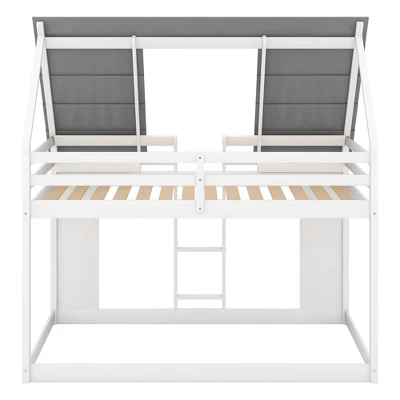 - [House Design] Featuring a pitched roof and wall section with a window, these house-shaped bunk beds create a fun and adorable space that not only serves as a comfortable sleeping area but also doubles as a space for your little ones to play and have fun.
