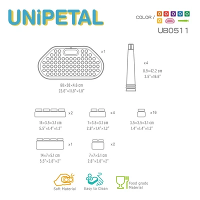 UNiPLAY UNiPetal activity table suitable for daycare, home and school. The table encourages social collaboration, strengthens motor skills, muscle and cognitive functions. The multiple colors enhances color recognition and visual development. Our activity table is friendly and soft. The soft edges keep children away from scratches and cuts. Easy to clean, time-saving, convenient and friendly for children all ages. The set includes 1 activity table and 25 building blocks in different colors and sizes. The table measures 24 x 12.3 x 6.5 in. and weighs 6.69 lbs. Recommended for ages 3 months and up.